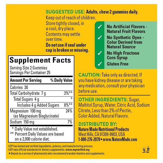 Nature Made High Absorption Magnesium Glycinate 100 mg per serving gummies support muscle relaxation, heart health, nerve health and bone health. This Nature Made Magnesium supplement is sourced from high-quality ingredients and uses a chelated Magnesium (Magnesium Bisglycinate) that is gentle on the stomach. Each Magnesium gummy is made with pectin not gelatin, and is gluten free with no artificial flavors, no high fructose corn syrup, and no synthetic dyes – color derived from natural source. These Nature Made Magnesium Glycinate gummies come in a delicious mixed berry with other natural flavors. These Magnesium 100mg per serving gummies are a tasty way to add some Magnesium to your diet. Adults chew two Magnesium gummies daily. Start your day with Nature Made Magnesium gummies for adults. Based on a 2022 survey of pharmacists who recommend branded vitamins and supplements. These statements have not been evaluated by the Food and Drug Administration. This product is not intended to diagnose, treat, cure, or prevent any disease. CAUTION: If you have kidney disease or are taking any medication, consult your physician before use.