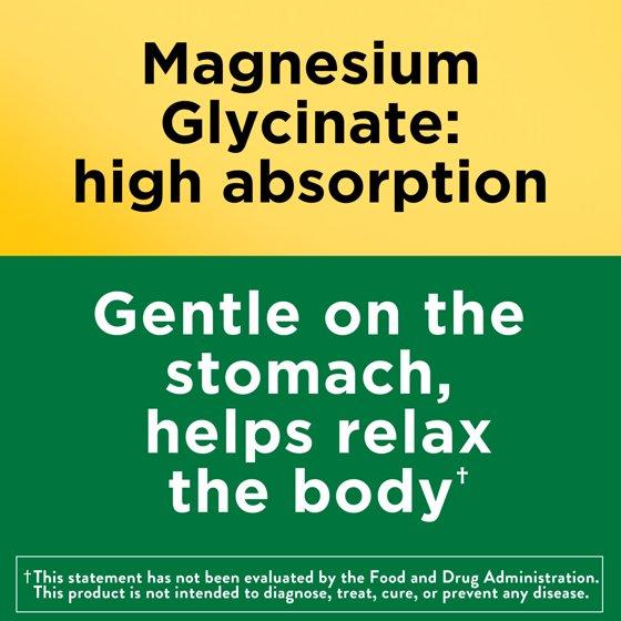 Nature Made Magnesium Glycinate 200 mg per serving is a chelated, high absorption Magnesium supplement for men and women that supports muscle relaxation, bone health, heart health, and nerve health. Sourced from high-quality ingredients, this gluten free Magnesium Glycinate supplement contains no color added and no artificial flavors. Magnesium is an essential mineral required for more than 300 enzymatic reactions in the body. Magnesium-Glycinate is gentle on the stomach, helps relax the body, and offers dietary support in two daily Magnesium capsules. With over half of the U.S. population not consuming enough Magnesium in their diet, Magnesium supplements, like this Magnesium Glycinate 200mg per serving supplement, help to contribute to the Magnesium your body needs (1). Adults take two Magnesium Glycinate capsules daily with water and a meal. Nature Made supplements are quality you can trust. (1) Reider, C.A.; Chung, R.-Y.; Devarshi, P.P.; Grant, R.W.; Hazels Mitmesser, S. Inadequacy of Immune Health Nutrients: Intakes in US Adults, the 2005–2016 NHANES. Nutrients 2020, 12, 1735. *Based on a survey of pharmacists who recommend branded vitamins and supplements. TRAACS™ is a trademark of Albion Laboratories, Inc. CAUTION: If you have kidney disease or are taking any medication, consult your physician before use.