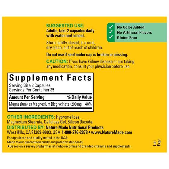 - Heart, nerve and bone support supplement: contains one 70 count bottle of Nature Made Magnesium Glycinate 200 mg per serving Capsules for a 35-day supply