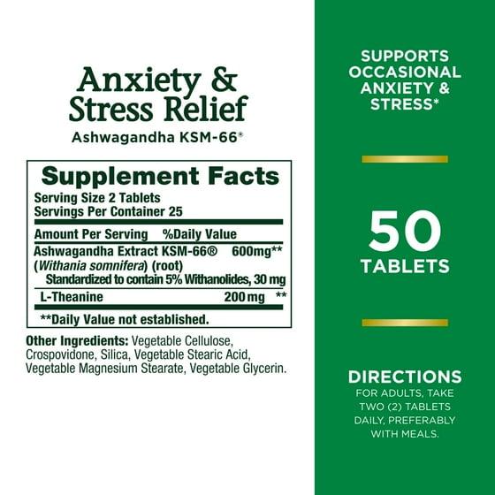 - Nature’s Bounty Anxiety & Stress Relief Ashwagandha KSM 66, L-Theanine, Dietary Supplement, Tablets, 50 Ct