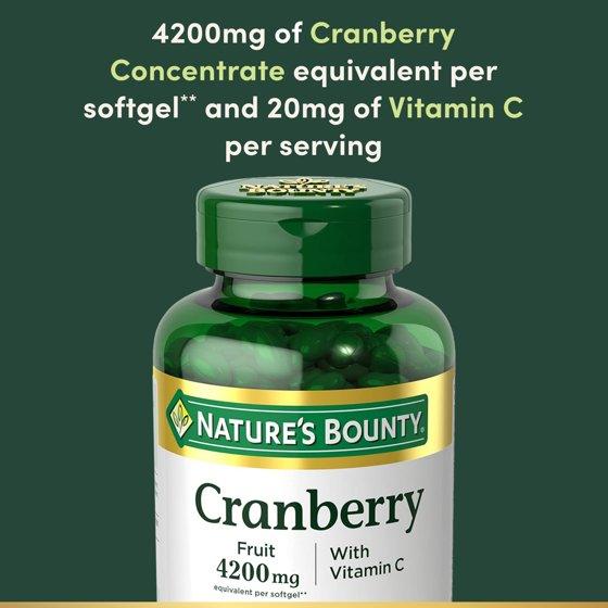 - PROMOTES URINARY HEALTH: 120-count, 4200mg, twin-pack Cranberry with Vitamin C Softgels. Nature’s Bounty Cranberry with Vitamin C Softgels support the walls of the bladder in both men and women.