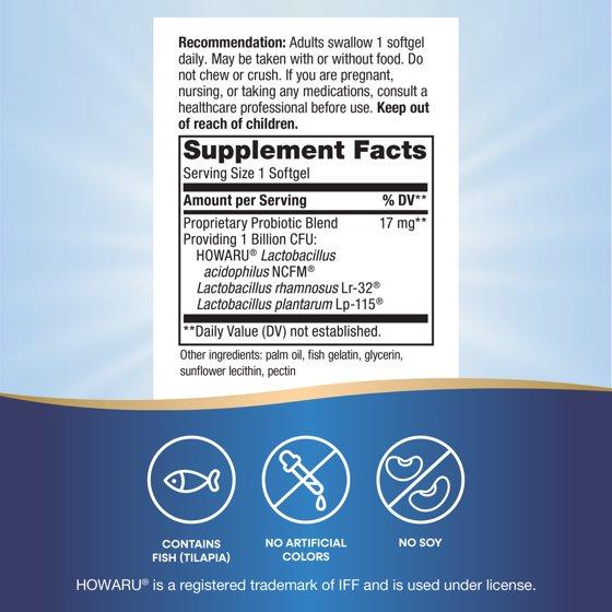 Proprietary Probiotic Blend: Providing 1 Billion CFU: Howaru Lactobacillus Acidophilus NCFM, L. Rhamnosus LR-32, L. Plantarum LP-115. Other Ingredients: Palm Oil, Fish Gelatin, Glycerin, Sunflower Lecithin, Pectin.