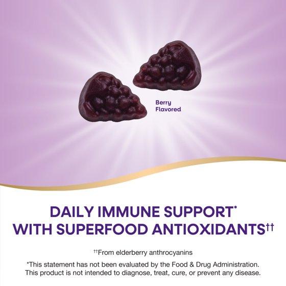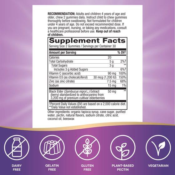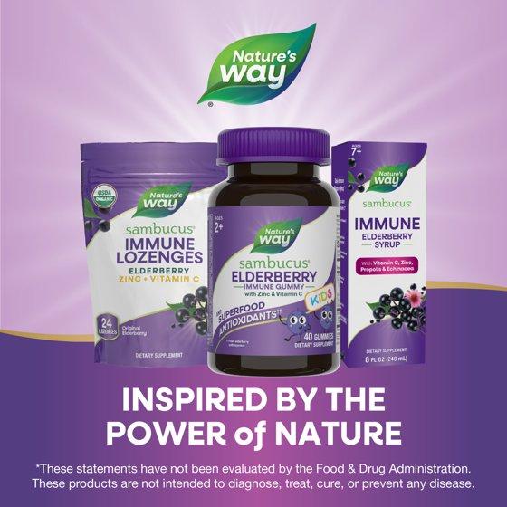 - Nature's Way Sambucus Elderberry Immune Gummies for Kids for ages 2+ provide immune support with an excellent source of vitamin C and zinc, and also contain premium, highly concentrated black elderberry extract.*