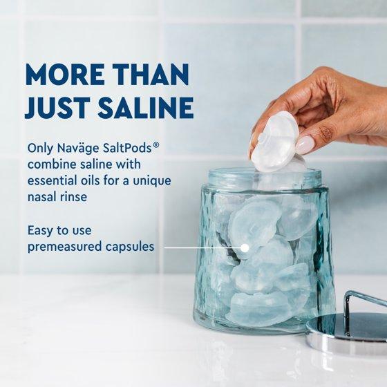 - More than Just Saline: 30 Navage Daytime & Nighttime SaltPod Capsules (15 each) to be used in your Navage Nasal Irrigation System, for relief that targets the rhythm of your day. Navage Day & Night SaltPods combine pure saline with essential oils to support your morning and evening needs.