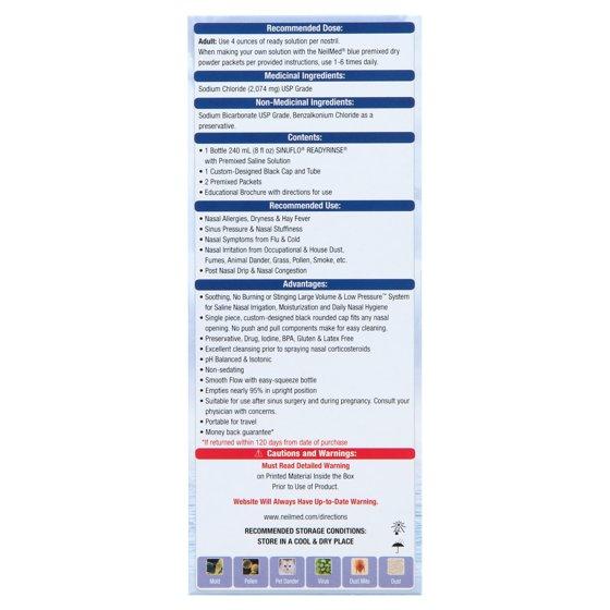- Contains: one unit of 240 mL (8 oz) SINUFLO READYRINSE reusable premixed saline bottle, 1 sinus rinse nasal irrigation tip and tube, 2 SINUS RINSE refill packets for adults