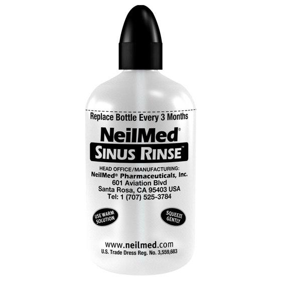 Please read Warning before using. Our recommendation is to replace the bottle every three months. USE ONLY AS DIRECTED, IF SYMPTOMS PERSIST SEE YOUR DOCTOR/HEALTHCARE PROFESSIONAL. ALWAYS READ THE LABEL. • Step 1 Please wash your hands. Fill the clean bottle with the designated volume of distilled, microfiltered (through 0.2 micron filter), reverse osmosis filtered, commercially bottled, or previously boiled and cooled down water. *You may warm the water in a microwave in increments of 5 to 10 seconds to avoid overheating the water, damaging the device or scalding your nasal passage. • Step 2 Cut the SINUS RINSE mixture packet at the corner and pour its contents into the bottle. Tighten the cap and tube on the bottle securely. Place one finger over the tip of the cap and shake the bottle gently to dissolve the mixture. Always rinse your nasal passages with NeilMed SINUS RINSE packets only. • Step 3 Standing in front of a sink, bend forward to your comfort level and tilt your head down. Keeping your mouth open, without holding your breath, place the cap snugly against your nasal passage. SQUEEZE BOTTLE GENTLY until the solution starts draining from the OPPOSITE nasal passage. Some may drain from your mouth. For a proper rinse, keep squeezing the bottle GENTLY until at least 1/4 to 1/2 (60 mL to 120 mL or 2 to 4 fl oz) of the bottle is used. Do not swallow the solution. • Step 4 Blow your nose very gently, without pinching nose completely to avoid pressure on eardrums. If tolerable, sniff in gently any residual solution remaining in the nasal passage once or twice, because this may clean out the posterior nasopharyngeal area, which is the area at the back of your nasal passage. At times, some solution will reach the back of your throat, so please spit it out. To help drain any residual solution, blow your nose gently while tilting your head forward and to the opposite side of the nasal passage you just rinsed. • Step 5 Now repeat steps 3 and 4 for your other nasal passage. Most users find that rinsing twice a day is beneficial, similar to brushing your teeth. Many doctors recommend rinsing 3-4 times daily or for special circumstances, even rinsing up to 6 times a day is safe. Please follow your physician’s advice. • Step 6 Clean the bottle and cap. Air dry the Sinus Rinse bottle, cap, and tube on a clean paper towel, a lint free towel, or use NeilMed NasaDOCK or NasaDOCK plus (sold separately) to store the bottle, cap and tube. It is very important to keep these devices clean and free from any contamination. Replace the bottle every 3 months. NeilMed SINUS RINSE Squeeze Bottle: - Please perform routine inspections of the bottle and tube for any discolorations and cracks. If there are any visual signs of deterioration or permanent color changes, please clean thoroughly. If the discolorations remain after cleansing, discard the items and purchase new ones. Please follow these instructions after each use of the product. Be sure to replace your product after three months. • Step 1: Rinse the cap, tube and bottle using running water. Fill the bottle with distilled, micro-filtered (through 0.2 micron), reverse osmosis filtered, commercially bottled or previously boiled and cooled down water at lukewarm or body temperature. • Step 2: Add a few drops of dish washing liquid or baby shampoo. • Step 3: Attach the cap and tube to the bottle; hold your finger over the opening in the cap and shake the bottle vigorously. • Step 4: Squeeze the bottle hard to allow the soapy solution to clean the interior of the tube and the cap. Empty out the bottle completely. • Step 5: Rinse the soap from the bottle, cap and tube thoroughly and place the items on a clean paper towel to dry or use the preferred NasaDOCK or NasaDOCK Plus.