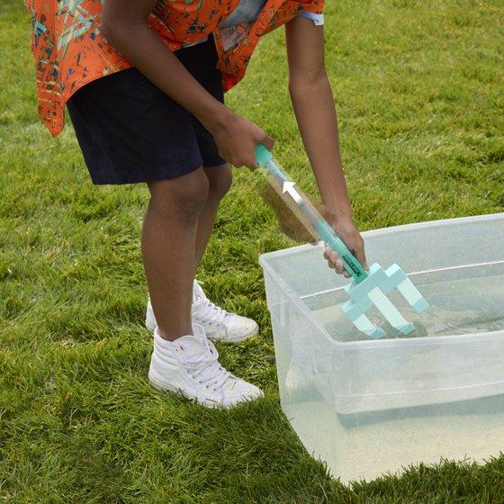 - FILL AND BLAST: Dunk the front of the trident in water, pull the handle all the way back to fill the tank, then push the handle forward to blast water