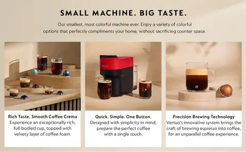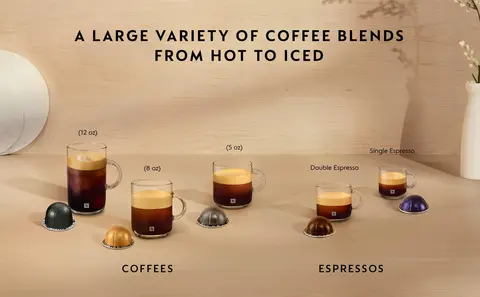 - SIGNATURE COFFEES AND ESPRESSOS: Vertuo Pop offers a variety of coffee formats in 4 sizes, including 5 oz and 8oz coffees, as well as single and double espressos brewed hot or over ice.