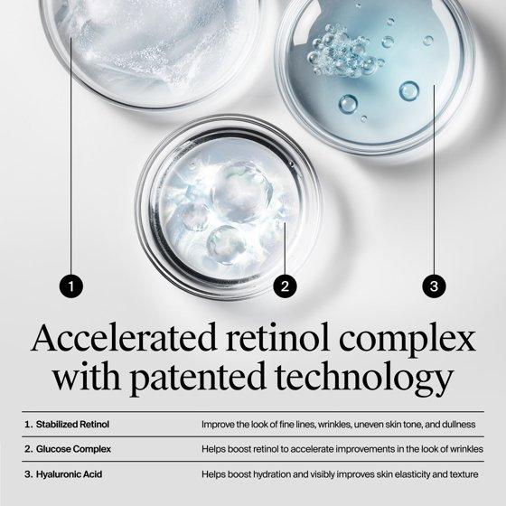- Accelerated retinol complex visibly renews the look of skin texture & evens tone