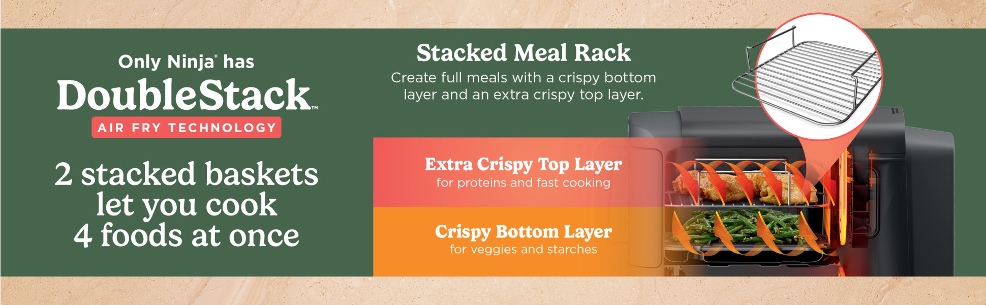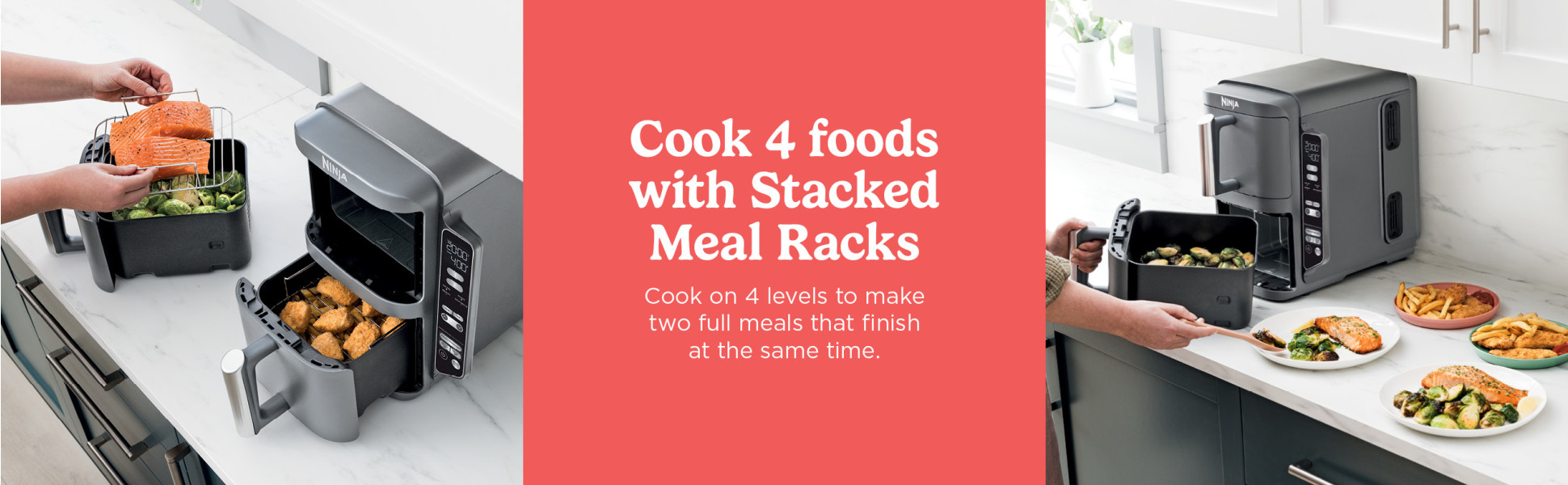 - Cook 4 Foods With Stacked Meal Racks: Comes with 2 removable stacked meal racks, allowing cooking on 2 levels per basket superheated air surrounds both foods for an all-around crisp