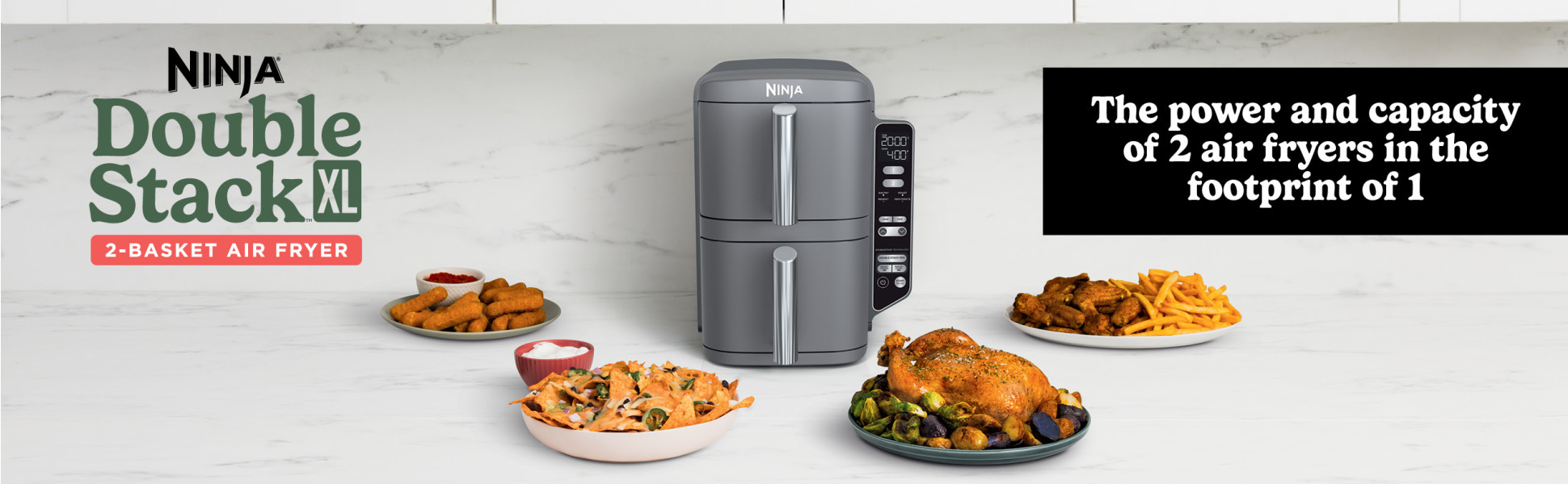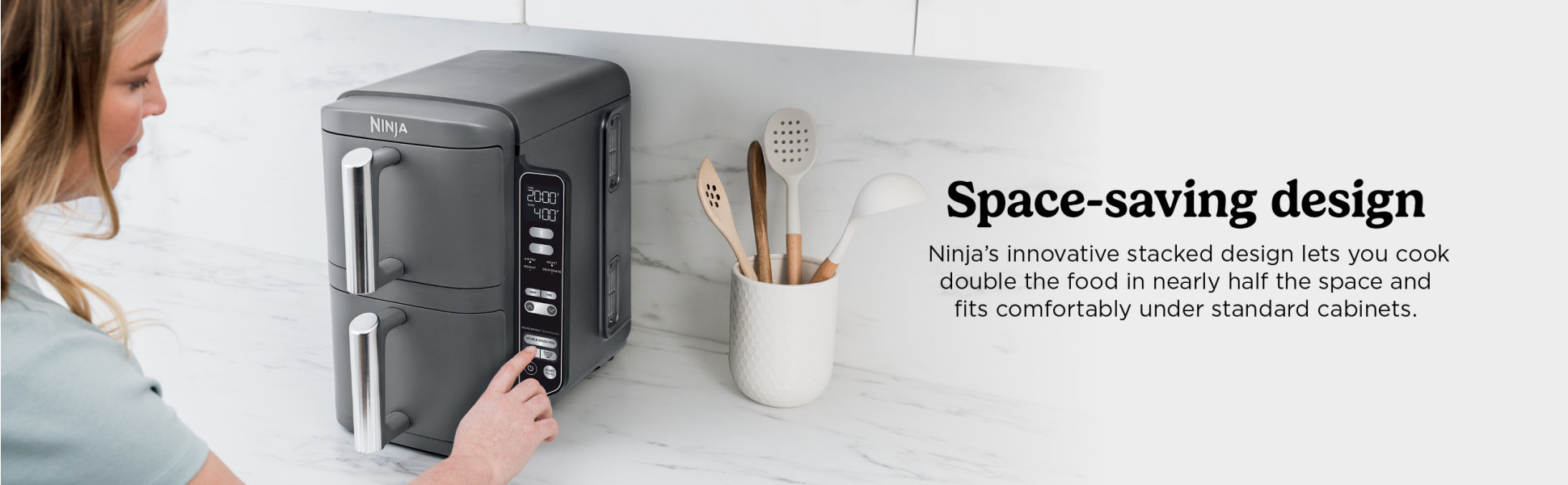- Space Saving Design: Ninja's stacked design allows you to cook double the food in nearly half the space, fitting comfortably under standard cabinets It's 40% slimmer than traditional 2-basket air fryers