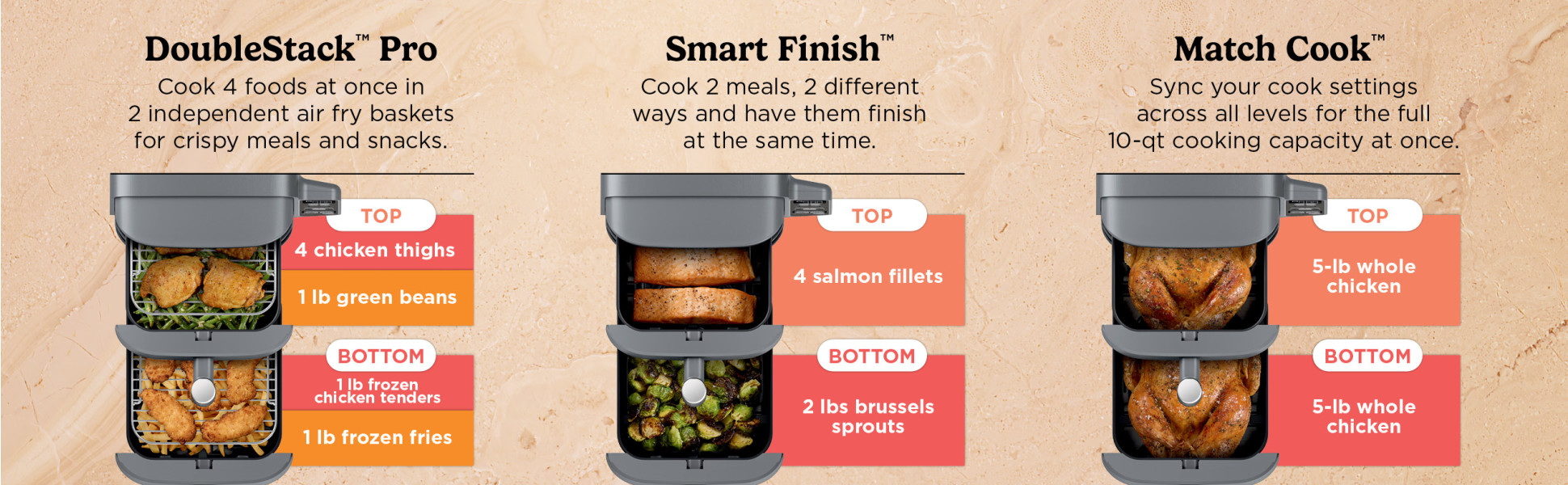 - Smart Finish & Match Cook: Choose between the Smart Finish feature for cooking 2 foods 2 ways that finish at the same time, or the Match Cook feature to easily copy settings across zones for full 10-qt capacity meals