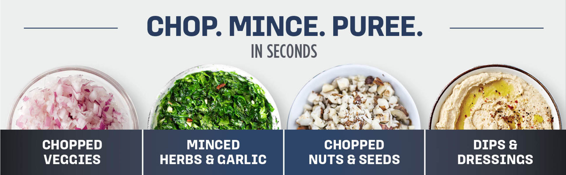 • EXPRESS MACHINE FOR ALL: Chop, mince, and puree ingredients into soups, sauces, dressings, topping, dips and more!