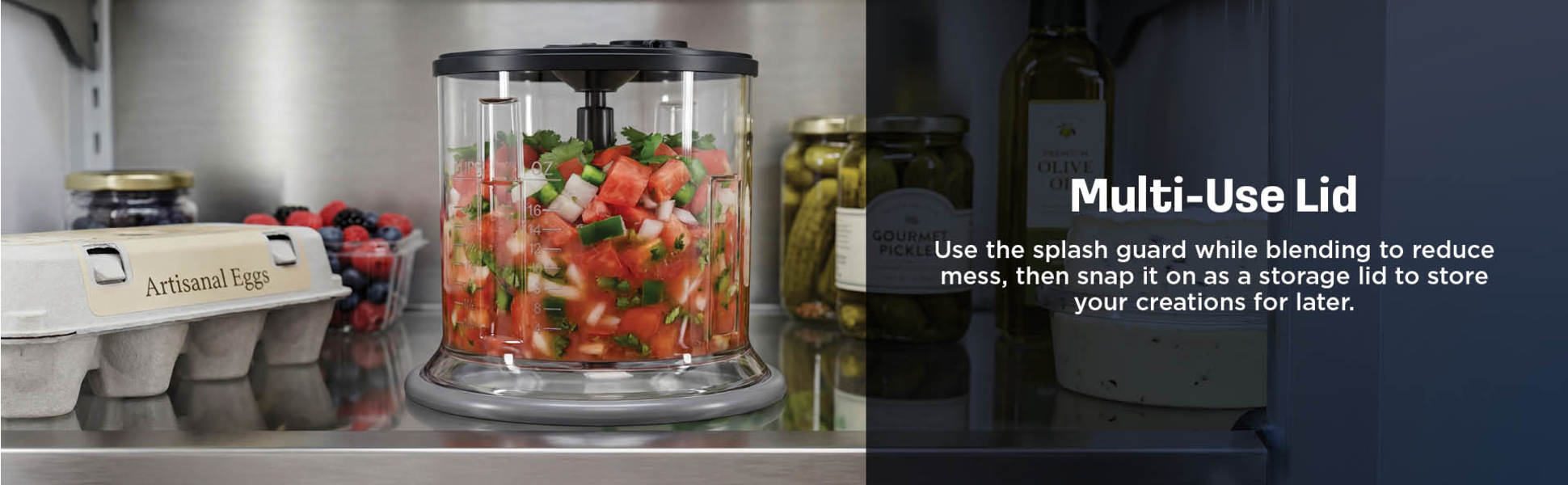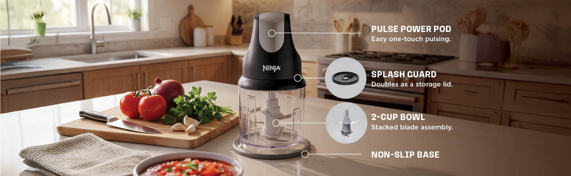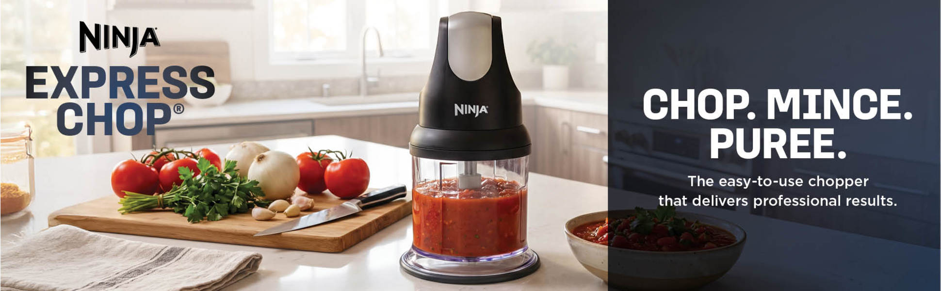 The Ninja® Express Chop® is perfect for Chopping, Mincing and Pureeing ingredients into soups, sauces, dressings, toppings, dips & more. The Express Chop® has Ninja blade technology that chops vegetables evenly every time, minces garlic and other herbs quickly, and purees ingredients for sauces and dressings. Its easy-to-use power pod has one-touch pulsing for perfect results in just seconds, plus it is ergonomically designed for easy handling. The splash guard even doubles as a storage lid! All parts are BPA free and all detachable parts are dishwasher safe. 3 lb.
