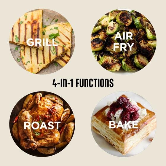 - Perfect char-grilled results with Grill Control settings: Low, Medium, High, and Max. The wide temperature range of 250F- 500F and variable fan speed enable 4 fast, versatile cooking functions: Grill, Air Crisp, Roast, and Bake