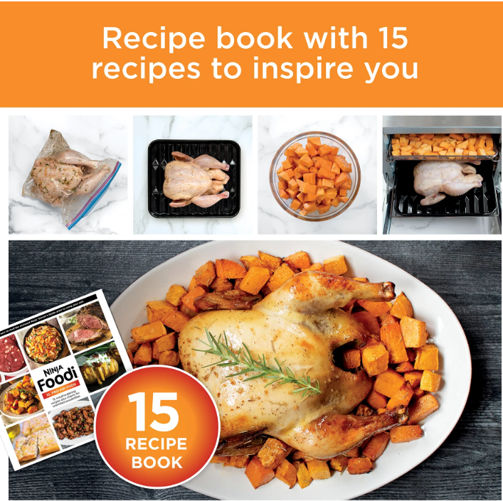 Meet the Ninja® Foodi® XL Pro Air Oven DT200, the oven that delivers up to 10X more convection power vs. a built-in wall oven. The Ninja® Foodi® XL Pro Air Oven has the capacity to cook on two levels, so you can roast a 5-lb chicken alongside a basket of vegetables, cook two 12-inch pizzas, or air fry up to 4 lbs of ingredients. Two-level cooking is enabled by True Surround Convection, which delivers up to 30% faster cook times than a traditional full-size oven with no rotation or swapping of pans necessary. This convection system is equipped with a high-velocity fan that distributes up to 130 CFMs of superheated air, a rear heat source, and a uniquely designed top-to-bottom ventilation system that circulates the superheated air. The versatile oven has 8 functions to choose from: Air Fry, Air Roast, Bake, Whole Roast, Broil, Toast, Bagel, and Pizza. Included with the oven is a sheet pan, air fry basket, roast tray, removable crumb tray, and chef-created recipe book.