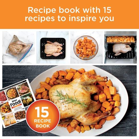 Meet the Ninja® Foodi® XL Pro Air Oven DT200, the oven that delivers up to 10X more convection power vs. a built-in wall oven. The Ninja® Foodi® XL Pro Air Oven has the capacity to cook on two levels, so you can roast a 5-lb chicken alongside a basket of vegetables, cook two 12-inch pizzas, or air fry up to 4 lbs of ingredients. Two-level cooking is enabled by True Surround Convection, which delivers up to 30% faster cook times than a traditional full-size oven with no rotation or swapping of pans necessary. This convection system is equipped with a high-velocity fan that distributes up to 130 CFMs of superheated air, a rear heat source, and a uniquely designed top-to-bottom ventilation system that circulates the superheated air. The versatile oven has 8 functions to choose from: Air Fry, Air Roast, Bake, Whole Roast, Broil, Toast, Bagel, and Pizza. Included with the oven is a sheet pan, air fry basket, roast tray, removable crumb tray, and chef-created recipe book.