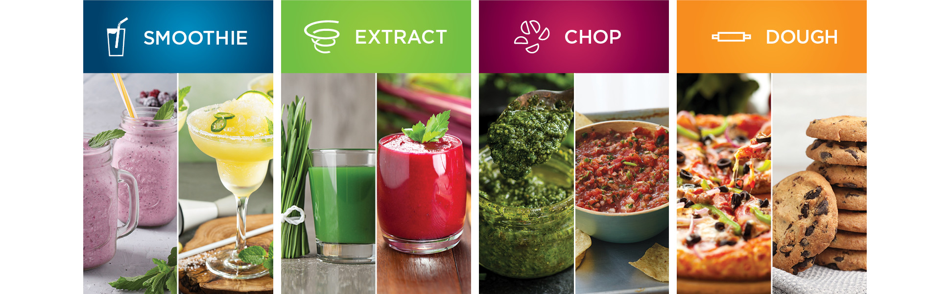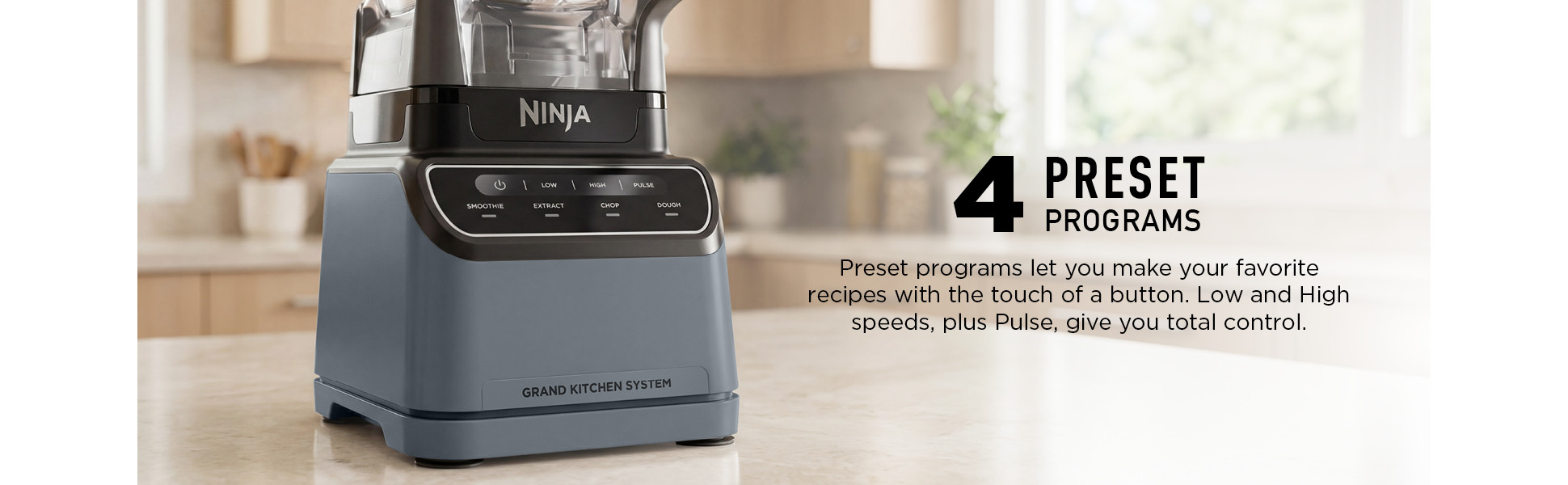 - (4) Preset Programs: Controlled speed and time programs for Smoothie, Extract, Chop, and Dough to take the guesswork out of your favorite recipes.
