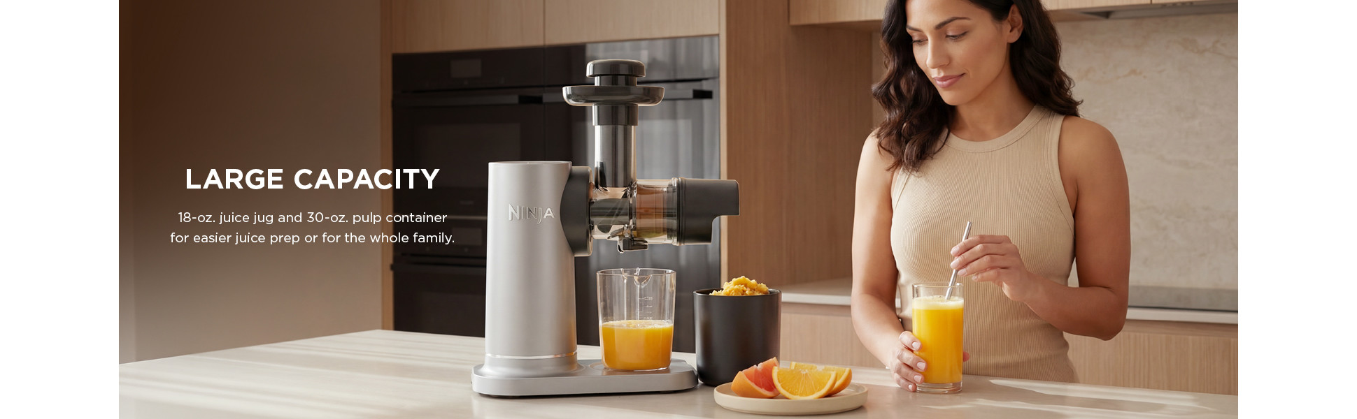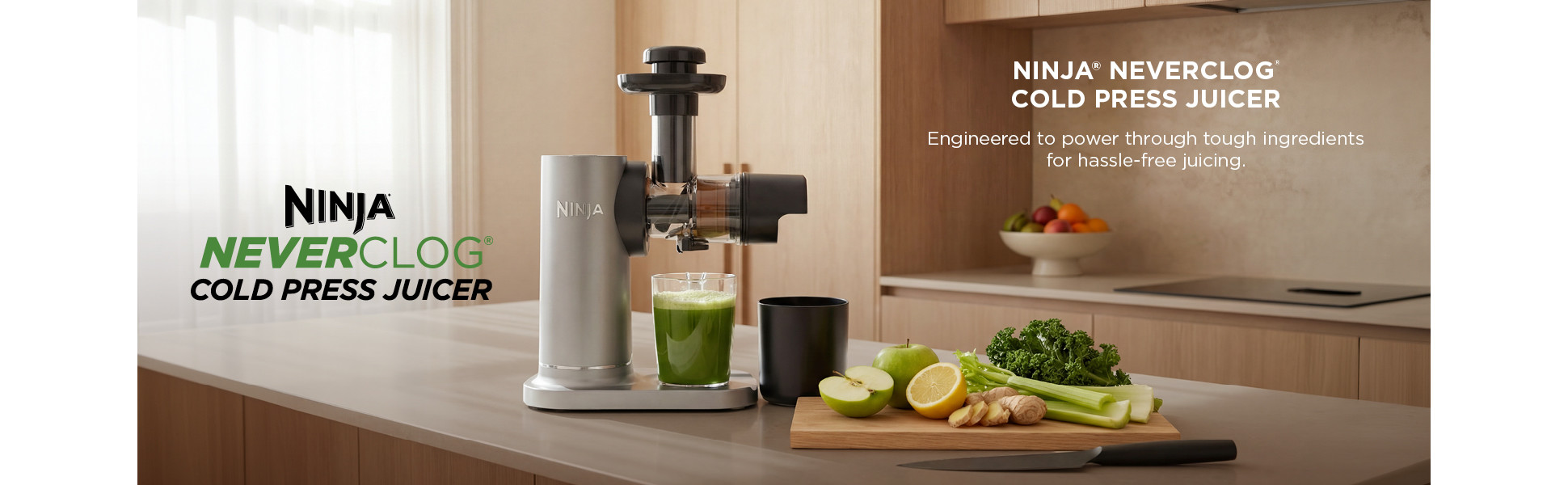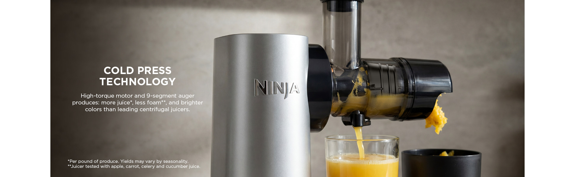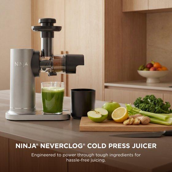 - Ninja NeverClog 150W Cold Press Juicer with 18oz Jug, 30oz Pulp Container, 2-Speed, Compact, JC150