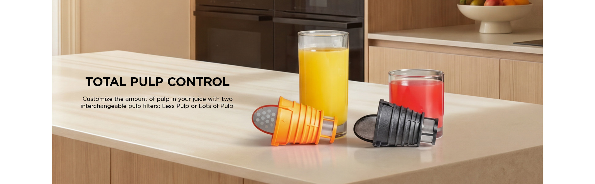 - CONTROL PULP: Total Pulp Control allows for customized juice with two interchangeable pulp filters: - Less Pulp, and Lots of Pulp.