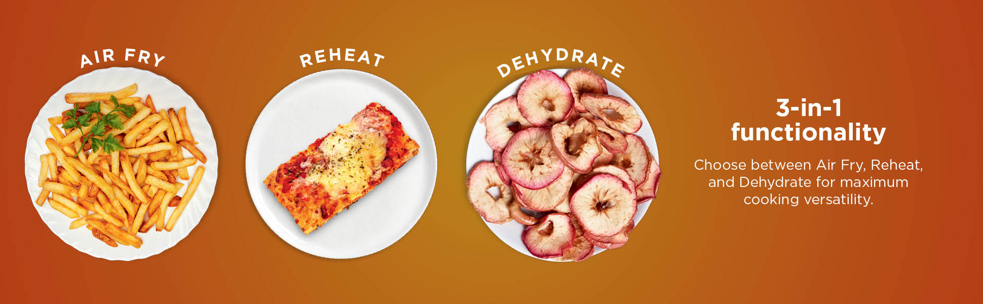 - 4-In-1 Functionality: Air Fry, Air Roast, Reheat, and Dehydrate for versatile cooking options
