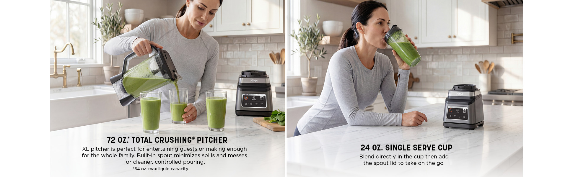 - The 72 Oz.* Total Crushing Pitcher Is Great For Making Large Batches For The Whole Family. *64 Oz. Max Liquid Capacity