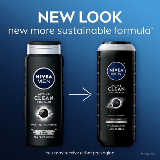 - One 16.9 fluid ounce bottle of NIVEA MEN Active Clean Charcoal Body Wash for Men, 3-in-1 Body, Face and Hair
