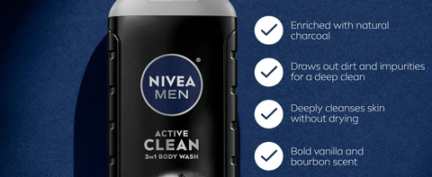 - One 16.9 fluid ounce bottle of NIVEA MEN Active Clean Charcoal Body Wash for Men, 3-in-1 Body, Face and Hair