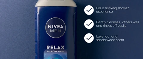 This 3IN1 formula gently cleanses your face, body and hair. Enriched with a lavender and sandalwood scent, it provides a relaxing shower experience so you can feel clean and refreshed. NIVEA cares for your skin & planet With 92% naturally-derived ingredients (including purified water + 8% skin safe synthetics) 99% biodegradable formula Vegan formula+ Free from microplastic particles, parabens and phthalates. Naturally-derived ingredients, including purified water, have undergone processing while retaining a majority of their natural molecular structure. Skin safe synthetics are included to maintain the integrity of the formula. As per OECD or equivalent methods. +No animal or animal derived ingredients.