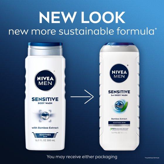 NIVEA MEN Sensitive Skin 3-in-1 Body Wash for Men, Bamboo Extract, Lightly Scented, 30 fl oz