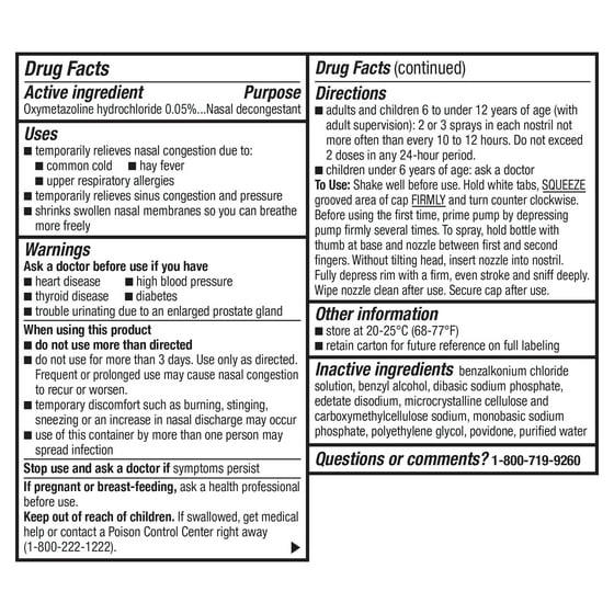 Warnings: Ask a doctor before use if you have: heart disease; high blood pressure; thyroid disease; diabetes; trouble urinating due to an enlarged prostate gland. When using this product: do not use more than directed; do not use for more than 3 days. Use only as directed. Frequent or prolonged use may cause nasal congestion to recur or worsen; temporary discomfort such as burning, stinging, sneezing or an increase in nasal discharge may occur; use of this container by more than one person may spread infection. Stop use and ask a doctor if symptoms persist. If pregnant or breast-feeding, ask a health professional before use. Keep out of reach of children. If swallowed, get medical help or contact a Poison Control Center right away (1-800-222-1222).