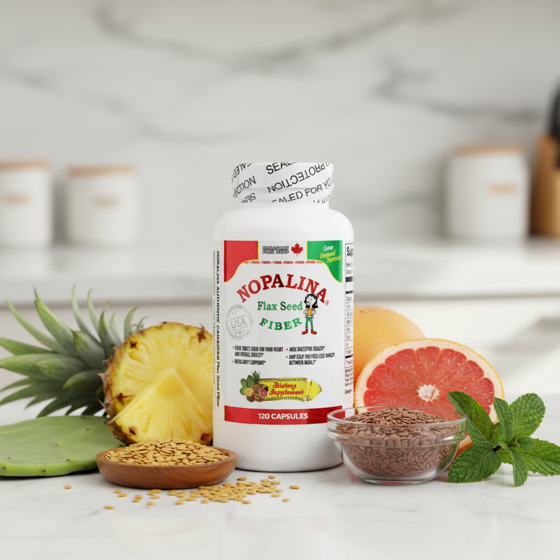 - Dietary Supplement. Canadian flax seed plus fiber. Nopalina health & beauty support. Provides omega 3, 6 and 9. Canadian flax seed. Wheat bran. Oat fiber. Senna leaves. Psyllium husk. Edible cactus. Orange fruit extract. Pineapple fruit extract,. Apple fruit extract. Grapefruit fruit extract. Helps maintain regularity. Helps support a healthy digestion. Helps support weight loss. Helps maintain healthy blood and cholesterol levels that are already within the normal range. Good source of dietary fiber. Guaranteed by Salud Natural Entrepreneurs: 100% natural product. www.nopalinausa.com. (These statements have not been evaluated by the Food and Drug Administration. This product is not intended to diagnose, treat, cure or prevent any disease.)