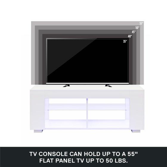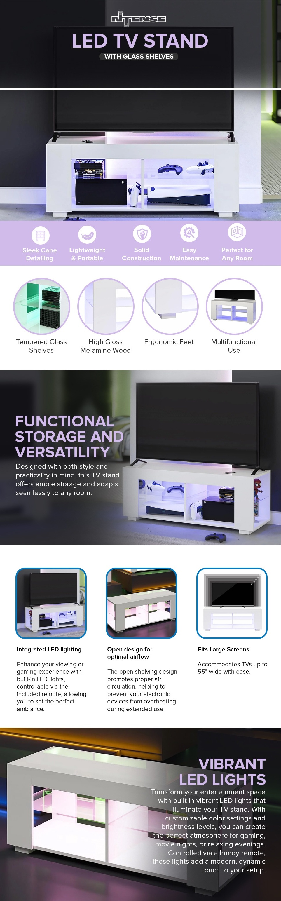 - VERSATILE TV STAND: The NTense LED TV Stand with Tempered Glass Shelves is made from high gloss melamine on engineered wood and accommodates most 55-inch flat-screen TVs