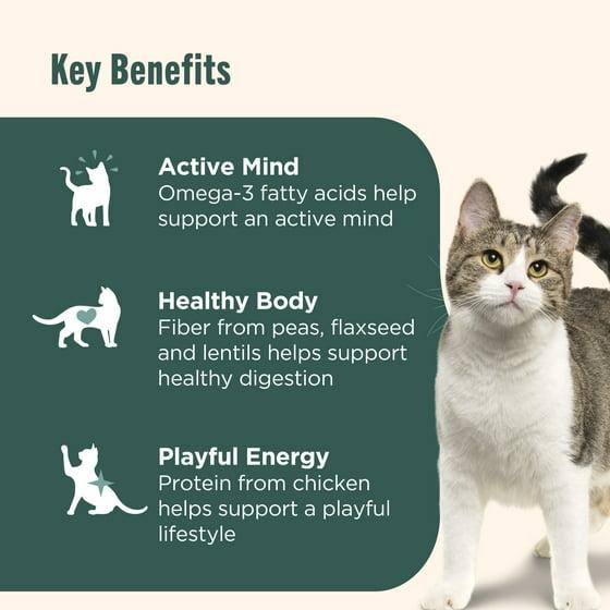 - Contains one (1) 3 lb. bag of premium dry cat food with chicken, lentils and salmon