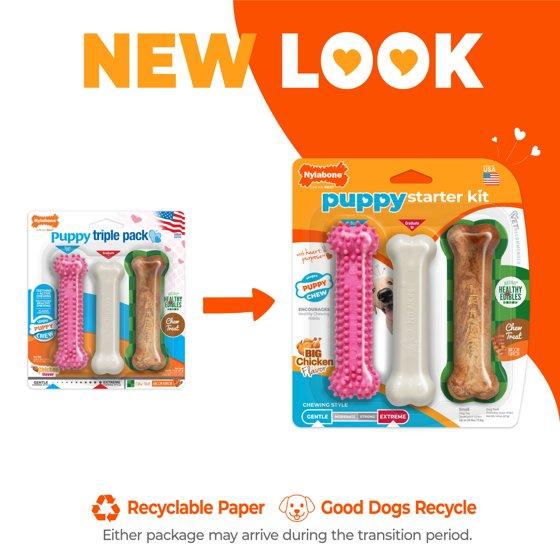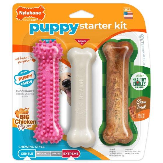 Nylabone Puppy Chew Dog Toy Starter Kit, Dog Chew Toys with Healthy Edibles Dog Treats, Chicken & Bacon Flavor, Pink, Small, 3 Pack