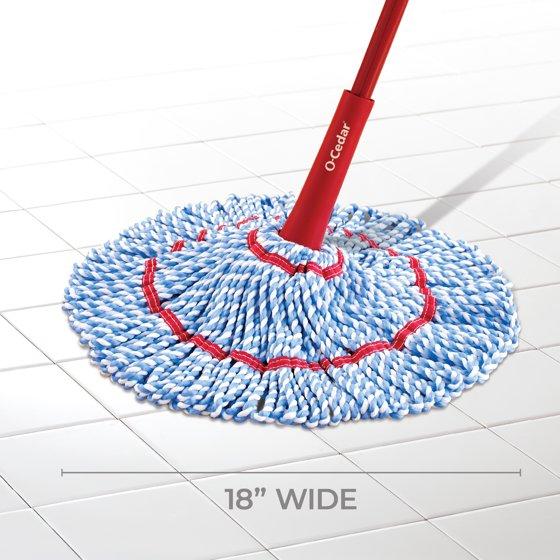 The O-Cedar MicroTwist™ Max Mop easily removes dirt, dust, hair, and grease for a cleaner home. It is designed with an integrated twist-handle for controlled wringing, an extra-large 18” head for mopping more surface area in less time, and a buffer pad to remove stubborn dirt. Compared to traditional cotton mops, this reusable and washable mop provides absorbency and effectively collects spills and particles while removing over 99% of bacteria with just water.* Once you mop the floor to your satisfaction, the 1-click mop head detaches and can be thrown into the wash. It is that easy!