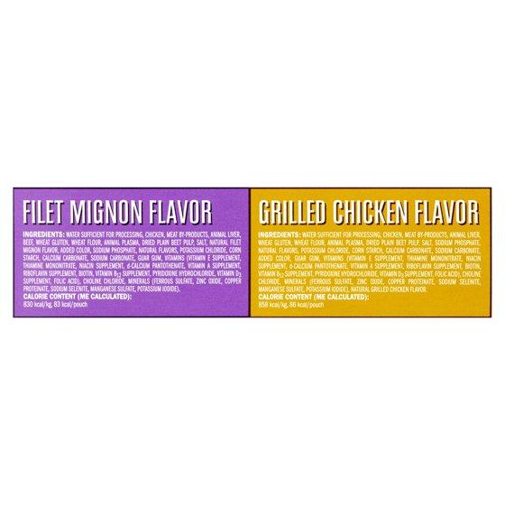 Fillet Mignon Flavor: Water Sufficient for Processing, Chicken, Meat By-Products, Animal Liver, Beef, Wheat Gluten, Wheat Flour, Animal Plasma, Dried Plain Beet Pulp, Salt, Added Color, Natural Filet Mignon Flavor, Guar Gum, Sodium Phosphate, Natural Flavors, Potassium Chloride, Corn Starch, Calcium Carbonate, Sodium Carbonate, Vitamins (Vitamin E Supplement, Thiamine Mononitrate, Niacin Supplement, D-Calcium Pantothenate, Vitamin A Supplement, Riboflavin Supplement, Biotin, Vitamin B12 Supplement, Pyridoxine Hydrochloride, Vitamin D3 Supplement, Folic Acid), Choline Chloride, Minerals (Ferrous Sulfate, Zinc Oxide, Copper Proteinate, Sodium Selenite, Manganese Sulfate, Potassium Iodide). Grilled Chicken Flavor: Water Sufficient for Processing, Chicken, Meat By-Products, Animal Liver, Wheat Gluten, Animal Plasma, Wheat Flour, Natural Flavor, Guar Gum, Dried Plain Beet Pulp, Salt, Sodium Phosphate, Potassium Chloride, Corn Starch, Added Color, Calcium Carbonate, Sodium Carbonate, Vitamins (Vitamin E Supplement, Thiamine Mononitrate, Niacin Supplement, D-Calcium Pantothenate, Vitamin A Supplement, Riboflavin Supplement, Biotin, Vitamin B12 Supplement, Pyridoxine Hydrochloride, Vitamin D3 Supplement, Folic Acid), Choline Chloride Minerals (Ferrous Sulfate, Zinc Oxide, Copper Proteinate, Sodium Selenite, Manganese Sulfate, Potassium Iodide), Natural Grilled Chicken Flavor.