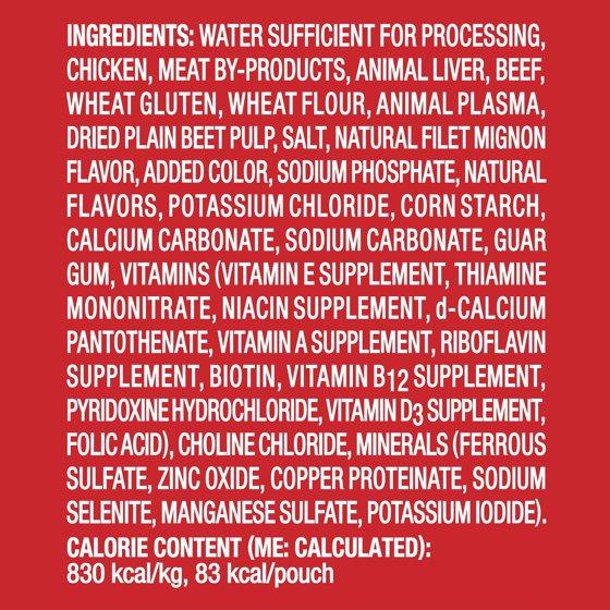 Water Sufficient for Processing, Chicken, Meat By-Products, Animal Liver, Beef, Wheat Gluten, Wheat Flour, Animal Plasma, Dried Plain Beet Pulp, Salt, Added Color, Natural Filet Mignon Flavor, Guar Gum, Sodium Phosphate, Natural Flavors, Potassium Chloride, Corn Starch, Calcium Carbonate, Sodium Carbonate, Vitamins (Vitamin E Supplement, Thiamine Mononitrate, Niacin Supplement, D-Calcium Pantothenate, Vitamin A Supplement, Riboflavin Supplement, Biotin, Vitamin B12 Supplement, Pyridoxine Hydrochloride, Vitamin D3 Supplement, Folic Acid), Choline Chloride, Minerals (Ferrous Sulfate, Zinc Oxide, Copper Proteinate, Sodium Selenite, Manganese Sulfate, Potassium Iodide).