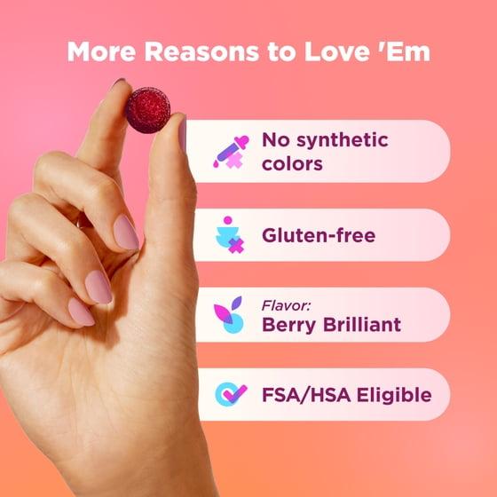 - Berry Brilliant flavored with other natural flavors, a tart & juicy blend of sweet, delicious berry flavors. 50 gummies per bottle for a 25 day supply