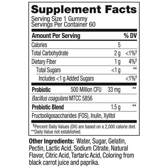 Probiotic: Bacillus Coagulans MTCC 5856. Prebiotic Blend: Fructooligosaccharides (FOS), Inulin, Xylitol. Other Ingredients: Water, Sugar, Gelatin, Lactic Acid, Citric Acid, Natural Flavor, Tartaric Acid, Coloring from Anthocyanins.