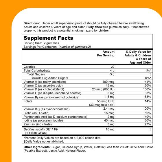 Vitamin A, Vitamin C, Vitamin D, Vitamin E, Vitamin B6, Folate, Vitamin B12, Biotin, Pantothenic Acid, Iodine, Zinc, Bacillus subtillis DE111. Sugar, Glucose Syrup, Water, Gelatin, Carnauba Wax, Citric Acid, Color (Paprika Extract), Corn Starch, Lactic Acid, Natural Flavor, Tapioca Starch, Vegetable Oil (Canola and Coconut).