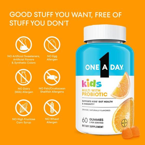 One A Day Kids Multivitamins Gummies with Immune Support, and Probiotics for kids Gut Health, Orange Flavor, 60 Count