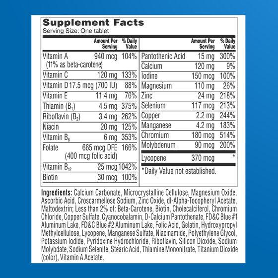 Calcium Carbonate, Magnesium Oxide, Microcrystalline Cellulose, Ascorbic Acid, Croscarmellose,Sodium, Zinc Oxide, dl-Alpha-Tocopheryl Acetate, Less than 2% of: Beta-Carotene, Biotin, Cholecalciferol, Chromium Chloride,Cupric Oxide, Cyanocobalamin, D-Calcium Pantothenate, FD&C Blue #1 Lake, FD&C Blue #2 Lake, Folic Acid, Hydroxypropyl, Methylcellulose, Lycopene, Manganese Sulfate, Niacinamide, Phytonadione, Polyethylene Glycol, Potassium Iodide, Pyridoxine, Hydrochloride, Riboflavin, Silicon Dioxide, Sodium Molybdate, Sodium Selenite, Stearic Acid, Thiamine Mononitrate, Titanium, Dioxide (color),Vitamin A Acetate