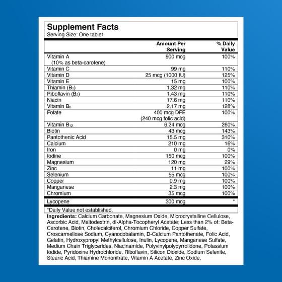 Calcium Carbonate, Magnesium Oxide, Microcrystalline Cellulose, Ascorbic Acid, Croscarmellose Sodium; Less than 2% of: Beta-Carotene, Biotin, Cholecalciferol, Chromium Chloride, Crospovidone, Cupric Oxide, Cyanocobalamin, D-Calcium Pantothenate, DL-Alpha-Tocopheryl Acetate, Folic Acid, Hydroxypropyl Methylcellulose, Lycopene, Manganese Sulfate, Niacinamide, Phytonadione, Pyridoxine Hydrochloride, Riboflavin, Silicon Dioxide, Sodium Selenite, Stearic Acid, Thiamine Mononitrate, Triacetin, Vitamin A Acetate, Zinc Oxide.
