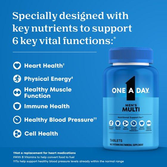 One A Day Men's Health Formula Multivitamins offer a wide variety of key nutrients in a single tablet. One A Day Men's Health Formula is ideal for men who are proactive about their health. This daily multivitamin is specially designed to address key health concerns of men. This easy to take tablet contains Vitamins A, B6, B12, C, D, E, and K, Riboflavin, Thiamin, Niacin, Folic Acid, Pantothenic Acid, Zinc, Manganese, Biotin, Magnesium, Copper, Lycopene, Calcium, Selenium, and Chromium. One A Day Men's Health Formula Multivitamin is Formulated to support:**** heart health*, healthy blood pressure**, immune health, healthy muscle function, and physical energy*** by helping convert food to fuel. One A Day Men's Health Formula Multivitamins are free of gluten, wheat, dairy, artificial colors, and artificial sweeteners. Adult men should take one tablet daily with food. One A Day Multivitamins can provide nutritional support that you and your family may need. *Not a replacement for heart medications
