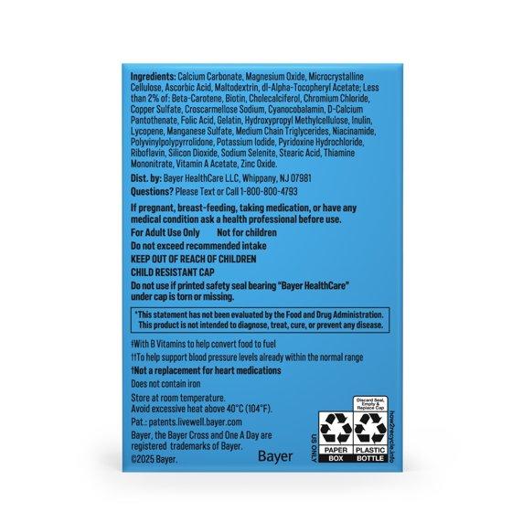 One A Day Men's Health Formula Multivitamins offer a wide variety of key nutrients in a single tablet. One A Day Men's Health Formula is ideal for men who are proactive about their health. This daily multivitamin is specially designed to address key health concerns of men. This easy to take tablet contains Vitamins A, B6, B12, C, D and E, Riboflavin, Thiamin, Niacin, Folic Acid, Pantothenic Acid, Zinc, Manganese, Biotin, Magnesium, Copper, Calcium, Selenium, and Chromium. One A Day Men's Health Formula Multivitamin is Formulated to support: heart health, healthy blood pressure, immune health, healthy muscle function, and physical energy by helping convert food to fuel. One A Day Men's Health Formula Multivitamins are free of gluten, wheat, dairy, artificial colors, and artificial sweeteners. Adult men should take one tablet daily with food. One A Day Multivitamins can provide nutritional support that you and your family may need. Not a replacement for heart medications To help support blood pressure levels already within the normal range This statement has not been evaluated by the Food and Drug Administration. This product is not intended to diagnose, treat, cure, or prevent any disease.