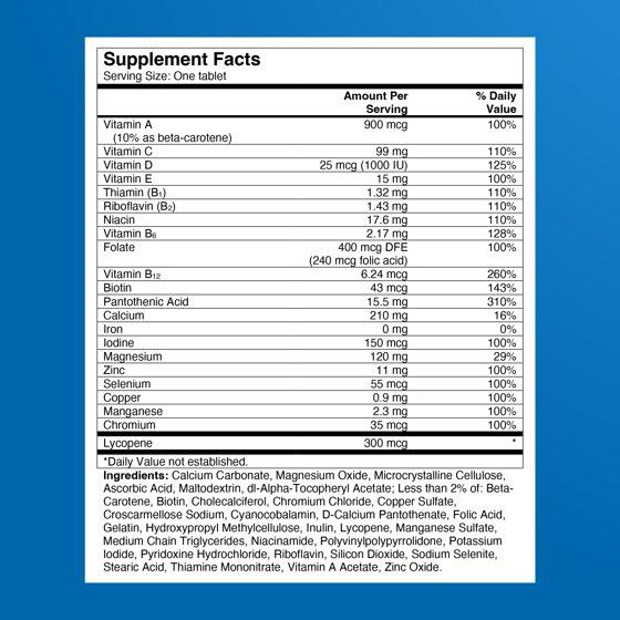 Calcium Carbonate Magnesium Oxide Microcrystalline Cellulose Ascorbic Acid Croscarmellose Sodium Less than 2% of: Beta-Carotene, Biotin, Cholecalciferol, Chromium Chloride, Crospovidone, Cupric Oxide, Cyanocobalamin, D-Calcium Pantothenate, dl-Alpha-Tocopheryl Acetate, Folic Acid, Hydroxypropyl Methylcellulose, Lycopene, Manganese Sulfate, Niacinamide, Phytonadione, Pyrixodine Hydrochloride, Riboflavin, Silicon Dioxide, Sodium Selenite, Stearic Acid, Thiamine Mononitrate, Triacetin, Vitamin A Acetate, Zinc Oxide