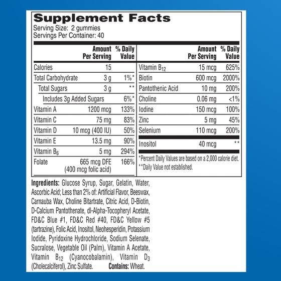 Glucose Syrup, Sucrose, Gelatin, Water, Ascorbic Acid; Less Than 2% Of: Artificial Flavors, Bees Wax, Carnauba Wax, Choline Bitartrate, Citric Acid, D-Biotin, D-Calcium Pantothenate, FD&C Blue #1, FD&C Red #40, FD&C Yellow #5 (tartrazine), Folic Acid, Inositol, Maltodextrin, Potassium Iodide, Pyridoxine Hydrochloride, Sodium Selenate, Sucralose, Vegetable Oil (Coconut or Palm), Vitamin A Acetate, Vitamin B12, Vitamin D3 (Cholecalciferol), Vitamin E Acetate, Zinc Sulfate.