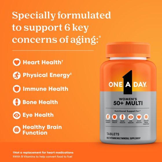 - Nutritional support for what matters most: One A Day womens 50 plus multivitamins are specially formulated with an excellent source of 15 essential nutrients to support 6 key concerns of aging: bone health, immune health, physical energy(1), heart health(2), healthy brain function & eye health