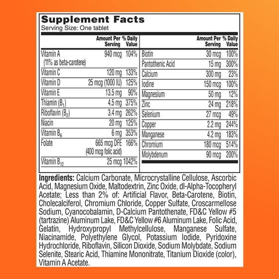 Calcium Carbonate, Microcrystalline Cellulose, Ascorbic Acid, Magnesium Oxide, Maltodextrin, Zinc Oxide, dl-AlphaTocopheryl Acetate, Croscarmellose Sodium; Less than 2% of: Artificial Flavors, Beta-Carotene, Biotin, Cholecalciferol, Chromium Chloride, Cupric Oxide, Cyanocobalamin, D-Calcium Pantothenate, FD&C Yellow #5 (tartrazine) Lake, FD&C Yellow #6 Lake, Folic Acid, Gelatin, Hydroxypropyl Methylcellulose, Manganese Sulfate, Niacinamide, Phytonadione, Polyethylene Glycol, Potassium Iodide, Pyridoxine Hydrochloride, Riboflavin, Silicon Dioxide, Sodium Molybdate, Sodium Selenite, Stearic Acid, Thiamine Mononitrate, Titanium Dioxide (color), Vitamin A Acetate.